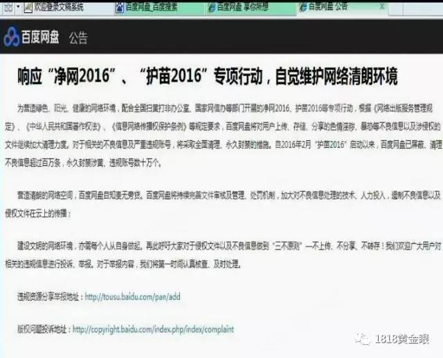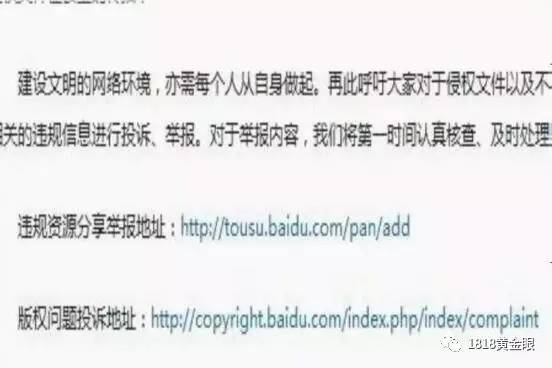在百度网盘官网的首页有一则发布于去年年中的“严打违规文件和盗版侵权”传播的公告。如果大家发现类似违规文件,可以通过微博客服热线、微信投诉、百度网盘违规资源举报网站进行举报。还要提醒大家,压缩包内很有可能隐藏计算机木马病毒,对您的财产造成威胁。