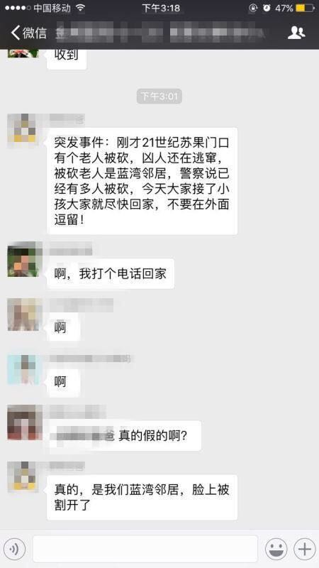 有人描述称,“金域蓝湾小区、苏果超市附近多人被刀砍伤。说是报复社会,见人就砍 …… 还专门砍女人 ……疯女人用刀划女人脸 ……”这一消息顿时引发市民恐慌,不少人提醒,“接了孩子尽快回家”“ 开车记得锁车门 " 等等。