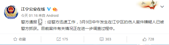 据网友爆料,砍人男子伪装成女子,在江宁小龙湾、万达等地砍伤多名女子面部,且嫌疑人目前仍未被抓获。甚至有网友呼吁住在江宁的女性朋友不要出门。事情果真如此吗?3月10日凌晨1点多,江宁警方官方微博 “@江宁公安在线”发布通报,经警方迅速工作,3月9日中午发生在江宁区的伤人案件嫌疑人已被警方抓获。目前案件有关情况正在进一步调查过程中。