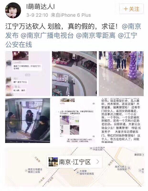 3月9日下午开始,南京江宁不少业主微信群、家长微信群中开始疯传,有一名男子在江宁见人就砍,已经伤了好几个人。