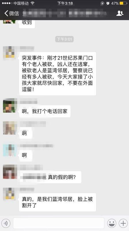 有人描述称,“金域蓝湾小区、苏果超市附近多人被刀砍伤。说是报复社会,见人就砍……还专门砍女人……”“疯女人用刀划女人脸……”这一消息顿时引发市民恐慌,不少人提醒,“接了孩子尽快回家““开车记得锁车门“等等。