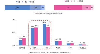 面对各种纪念日女性总是比男性更在意,清楚的记得纪念日的日期。但是,在准备礼物上却没有男性更用心。数据显示,多数男性会提前一周开始准备,占比42%明显高于女性。而女性提前一两天准备的比例则高于男性,占比35%。节日更像是男朋友或老公买礼物证明爱意的时候,是女朋友或老婆检验真心的时刻,每到节日,微博微信朋友圈慢慢的全是晒鲜花、晒礼物、晒红包、秀恩爱的。随着恋爱经验越来越丰富也更加懂得如何挑选礼物,礼物价格也更高。80后男性与85后女性在给对方送礼物时最肯花钱,分别为1233元和970元。总体来看,男性在给女友送礼的花费略高于女性。无论是在节日的准备上还是成本上,男性的态度都略胜一筹。