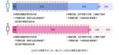 数据显示,半数男性与七成女性表示,重要日子里需要互赠有心意的礼物即可,不看重礼物的价格。而三成的男性很气度的认为只要自己给女友送就够了。在情人节、纪念日时,除了送礼物,过节的形式也越来越多种多样。调研显示,男性最愿意和女友一起在家自家做饭庆祝,女性则更愿意出去外面吃大餐庆祝,还有23%女性选择外出旅游,可见节日形式已经越来越多元化。