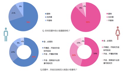 据《中国男女婚恋观系列调查》报告显示,七成男性和近九成女性仍然对恋爱中的小浪漫抱有期待,女性比男性的期待值高两成。但在制造惊喜的行动上,男性则显得比女性更主动,64%的男性表示会主动给恋人制造小惊喜,这一比例比女性高出10个百分点,而32%的女性则表示需要想想对方可能有何反应在决定是否主动制造小惊喜。