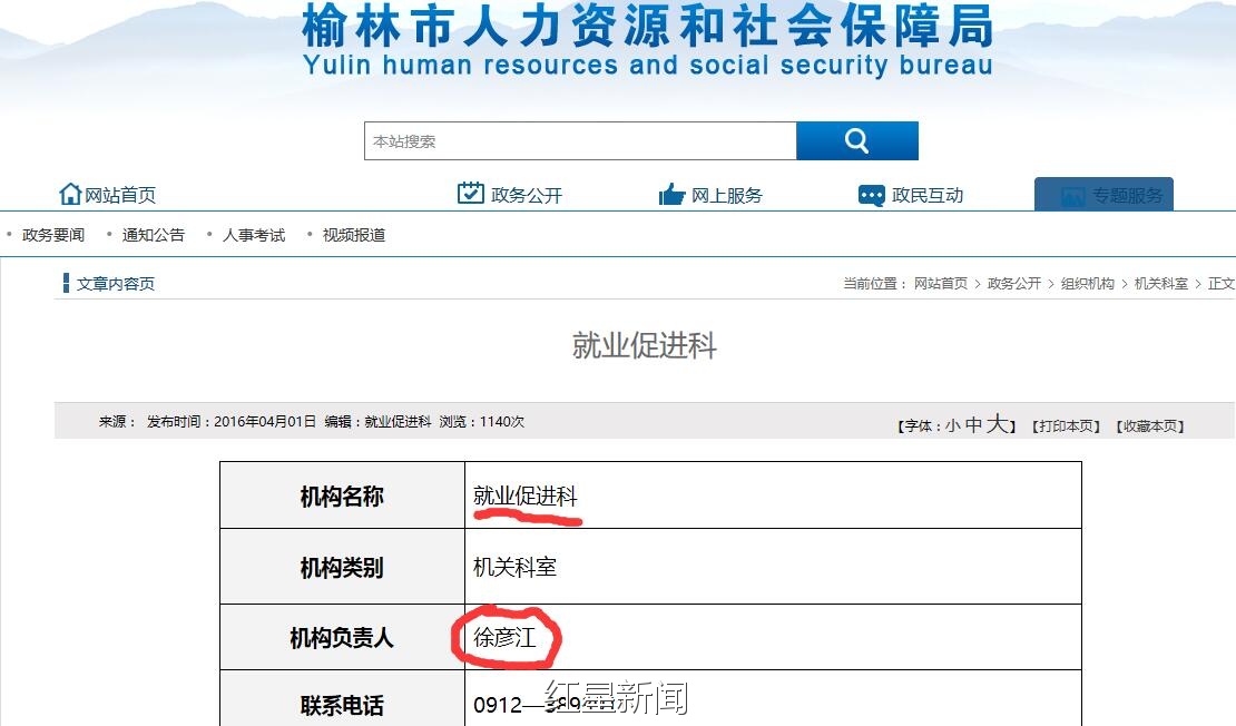 在榆林市人社局的官网上,这一疑问得到了解答。红星新闻在该网站政务公开-组织机构一栏中发现,该局就业促进科的科长正是徐彦江。