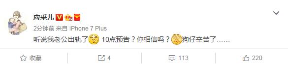 2月13日,应采儿通过微博发布,言语间否认老公出轨,“听说我老公出轨了10点预告?你相信吗?狗仔辛苦了……????”