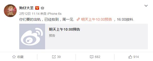 前两天,卓伟与其徒儿“狗仔大圣”在微博预告,2月13日将发布“周一见”,并提示拍到了明星出轨。