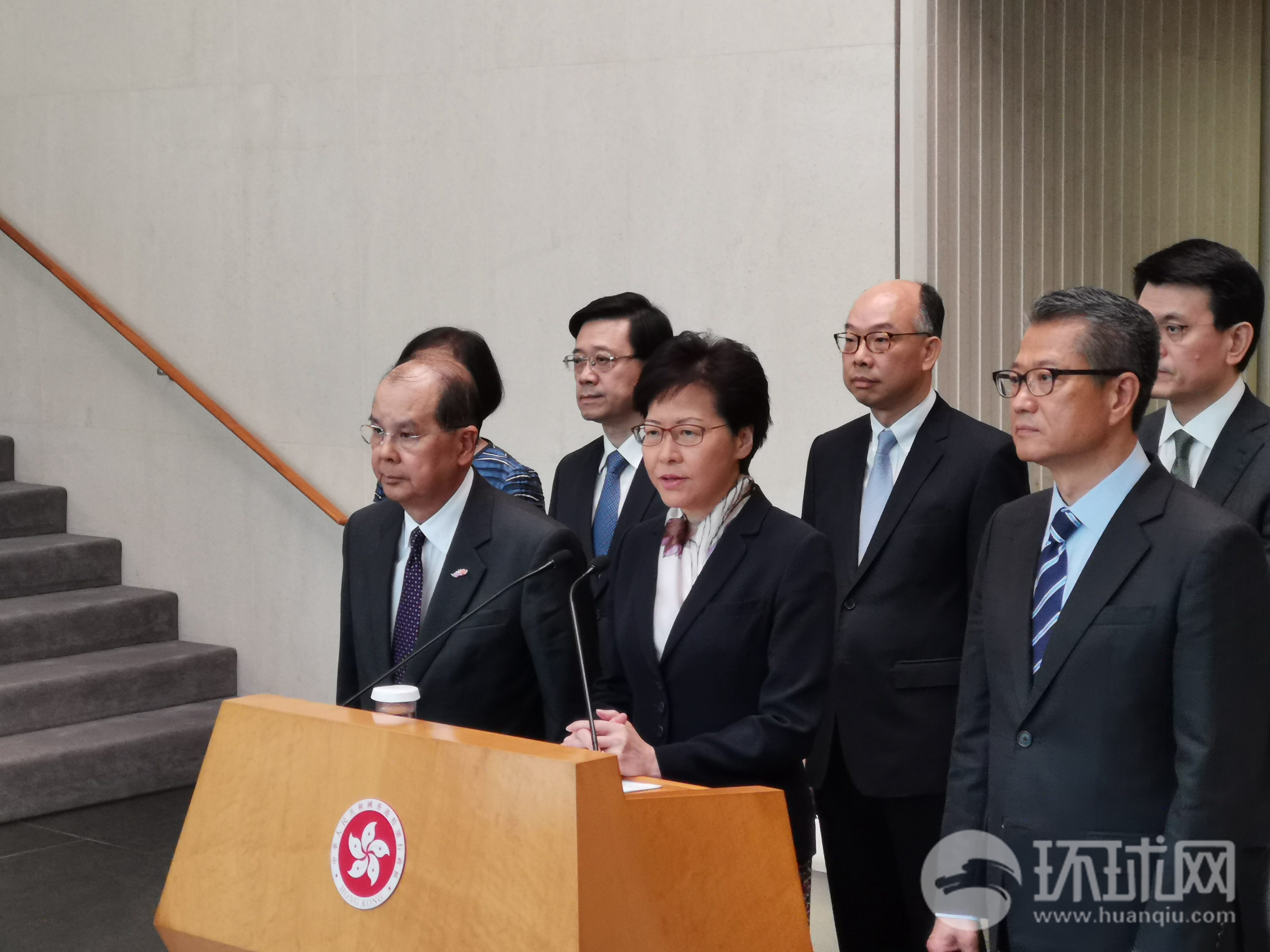 【环球时报-环球网赴香港特派记者 杨升】香港特首林郑月娥早上10时,与政务司司长张建宗和财政司司长陈茂波,在行政长官办公室地下大堂会见媒体。林郑月娥在发言中再次谴责游行示威中发生的暴力,并表示政府已启动跨部门应急机制,应对周一(5日)部分市民发起的罢工运动。林郑月娥表示,理解尊重部分市民表达诉求的权利,但罢工者也应该尊重其他市民不罢工的权利。