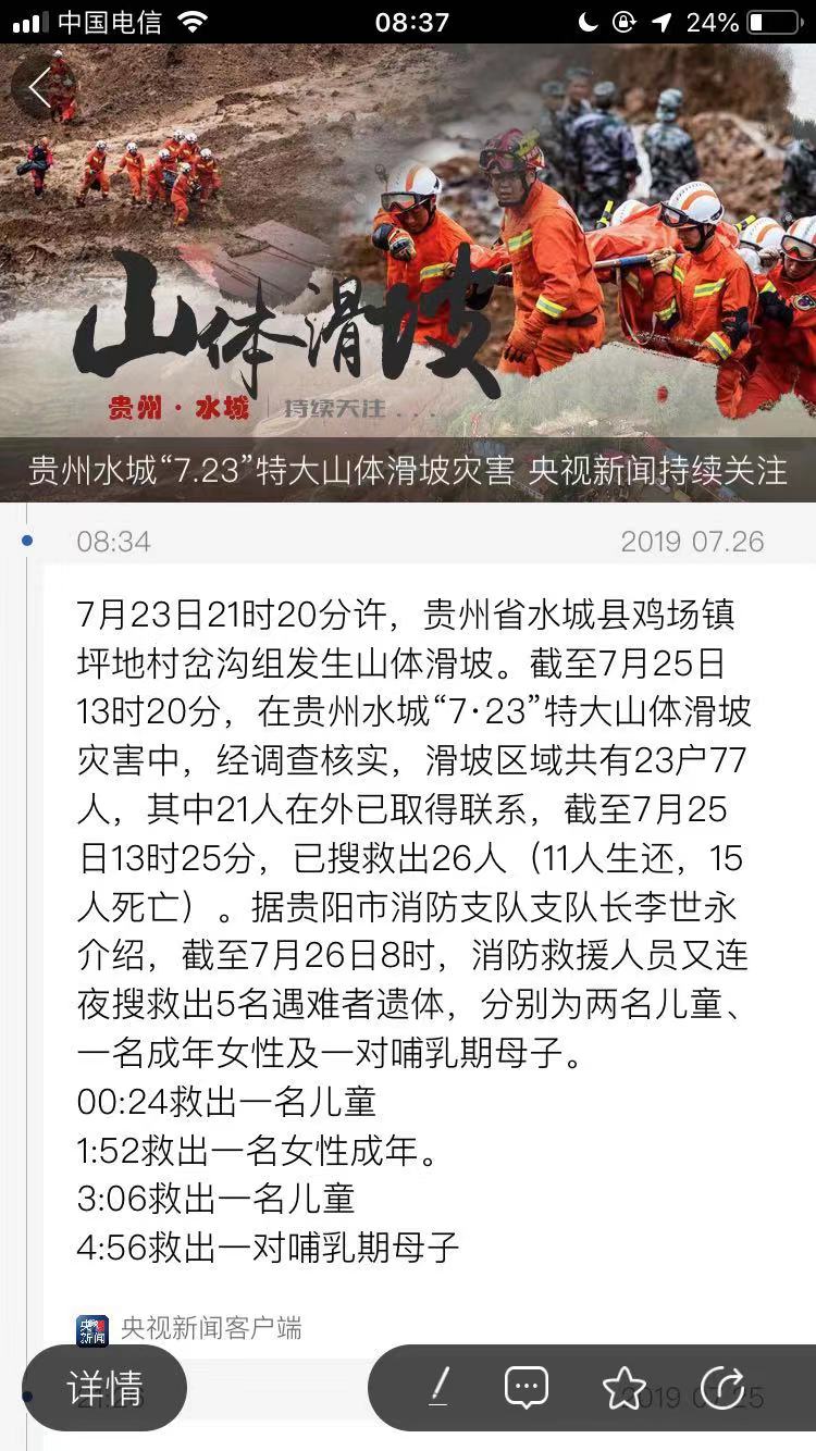 7月23日21时20分许,贵州省水城县鸡场镇坪地村岔沟组发生山体滑坡。截至7月25日13时20分,在贵州水城“7·23”特大山体滑坡灾害中,经调查核实,滑坡区域共有23户77人,其中21人在外已取得联系,截至7月25日13时25分,已搜救出26人(11人生还,15人死亡)。据贵阳市消防支队支队长李世永介绍,截至7月26日8时,消防救援人员又连夜搜救出5名遇难者遗体,分别为两名儿童、一名成年女性及一对哺乳期母子。
