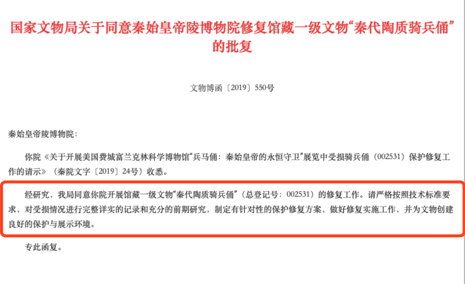 国家文物局同意了秦始皇帝陵博物院开展馆藏一级文物“秦代陶质骑兵俑”的修复工作,并要求“相关单位对受损情况进行完整详实的记录和充分的前期研究,制定有针对性的保护修复方案,做好修复实施工作,并为文物创建良好的保护与展示环境”。