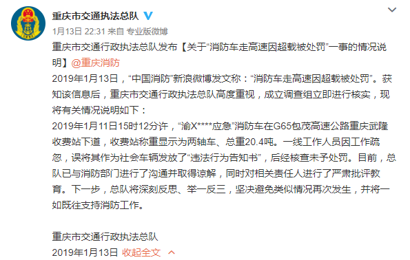 1月13日22时31分,重庆市交通执法总队官方微博就“消防车走高速因超载被处罚”一事发布情况说明,称事因一线工作人员疏忽,误将其作为社会车辆发放“违法行为告知书”,后经核查未予处罚。