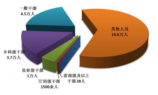 2018年上半年,全国纪检监察机关共接受信访举报168.3万件次,处置问题线索74万件,谈话函询15.4万件次,立案30.2万件,处分24万人(其中党纪处分20.1万人)。处分省部级及以上干部28人,厅局级干部1500余人,县处级干部1万人,乡科级干部3.7万人,一般干部4.5万人,农村、企业等其他人员14.6万人。