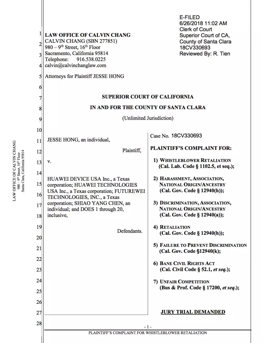 据了解,目前诉讼正常进行中。Jesse Hong主张了500万美元的工资和福利损失赔偿和1亿美元的惩罚性赔偿金以及法律费用。
