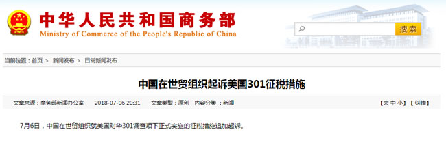 商务部网站消息,7月6日,中国在世贸组织就美国对华301调查项下正式实施的征税措施追加起诉。