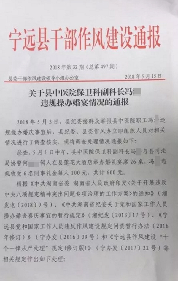宁远县通报:县中医院副科长婚宴收6个百元红包被责成免职