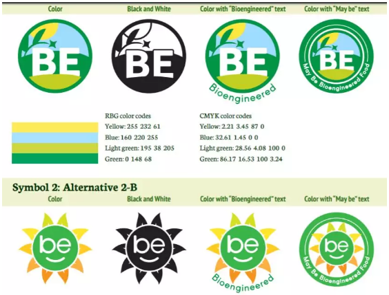 美国农业部列出的备选标识均以“BE”两个字母作为图案中心,意为“生物工程食品”(Bio engineered),而美国人对转基因食品的习惯叫法为“genetically modified”(缩写为GMO food)。