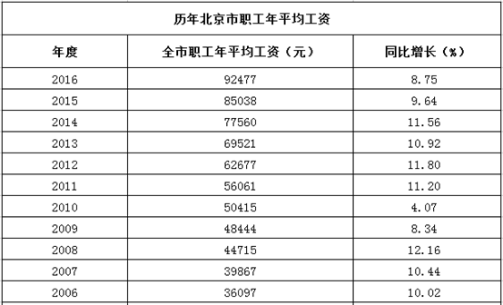 上图是北京市自2006年以来平均工资的变化情况,在2016年,北京市全市职工年平均工资是92477元,月平均工资则为7706,相比2015年增长8.75%。若是以这个增速来计算,预计2018年北京市的年平均工资为109390元,月平均工资为9116元。若是与北京平均工资的增速比起来,最低工资标准的增速或许依旧有发展空间。