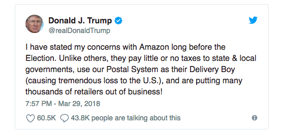 在担任总统职务前,特朗普就曾发推文说,“亚马逊对纳税零售商造成巨大损害,美国各地的城镇和州都受到伤害