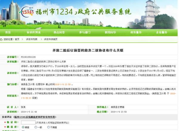 在福州市12345政府公共服务系统网站上,如今仍能看到“开放二胎后以前签的放弃二孩协议有什么关联”这则提问帖。