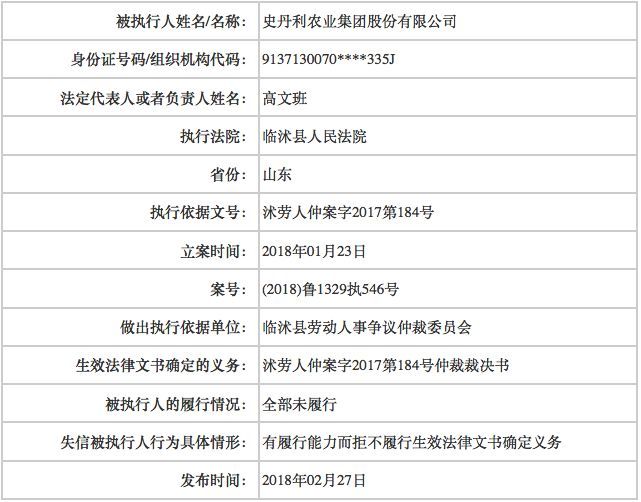 每经小编(微信号:nbdnews)从全国失信被执行人名单中查询获悉,被执行人名称为史丹利农业集团股份有限公司,法定代表人为高文班。法院执行依据文号为“沭劳人仲案字2017第184号”,立案时间为2018年1月23日,发布时间为2018年2月27日。