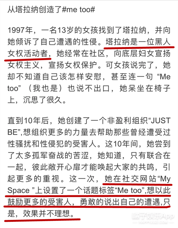 就这样,塔拉纳受到小女孩的启发开创了“ME too”的标签,不过真正流行起来是因为之后的哈维性侵丑闻。