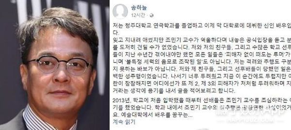 爆料出来后,赵敏基还否认来着,说自己没有对如女儿一般的学生们做出这种事,在接受JTBC新闻采访时,他辩解说自己是想指导学生用内心去演戏,仅用手轻拍了对方心口;至于与女学生唱K后拥抱,只是告别而已.......