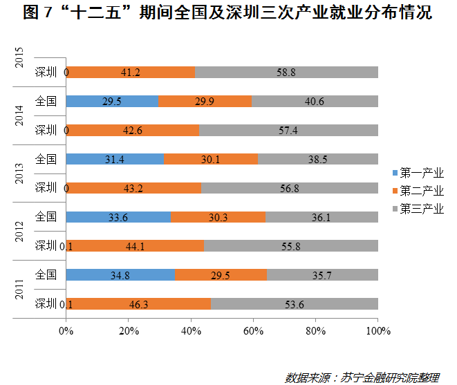 (四)常住人口就业的产业结构高端化。产业是人口的重要载体,相对全国而言,深圳的产业结构呈现出明显的“三二一”特征,其中第三产业占比更是超过当地GDP的50%,高于全国平均水平(见图6)。相应地,就业结构也与产业结构大致匹配,也呈现出“三二一”的特征(见图7)。
