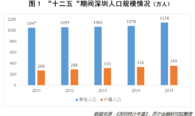 (一)户籍人口与流动人口倒挂。从人口规模看,深圳市人口在“十二五”期间呈现快速增长趋势,年均人口净增长率约为16.88‰。截至2015年底,深圳市年末常住人口约1138万人,其中户籍人口约为355万人,非户籍人口约为783万人,常住人口年平均增长约为10.17万人(见图1)。