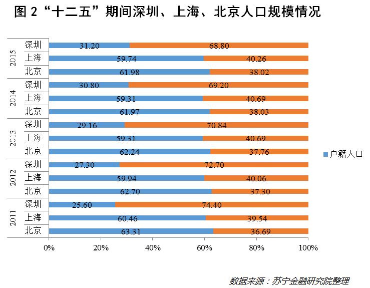 值得注意的是,相较北京、上海这些城市,深圳存在明显的户籍人口与非户籍人口比例“倒挂”现象(见图2),二者的比例一直在3:7左右,而同为国内流动人口集聚地的一线城市北京和上海,二者的比例均在6:4左右。由此可以推断,在全国主要一二线城市中,深圳常住人口结构是户籍人口和非户籍人口倒挂最为严重的城市。