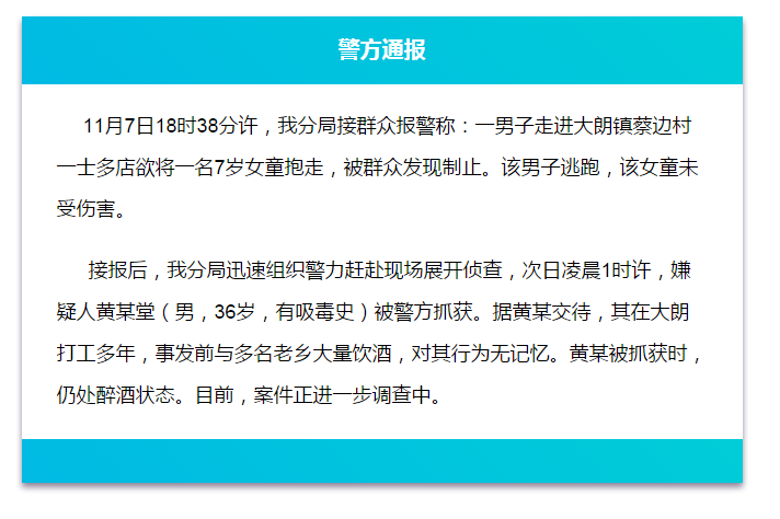 今天上午11时06分,东莞大朗公安分局发布通报。11月7日18时38分许,东莞大朗公安分局接群众报警称:一男子走进大朗镇蔡边村一士多店欲将一名7岁女童抱走,被群众发现制止。该男子逃跑,该女童未受伤害。