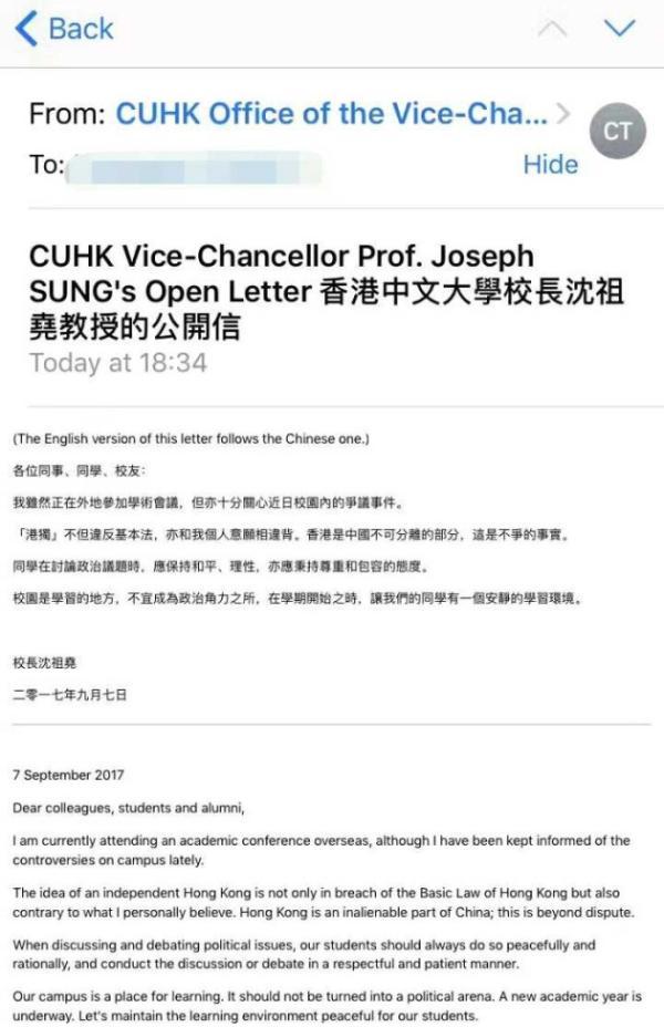 新华网微博9月8日消息,内地女生撕下“港独”海报、与“港独”学生激辩民主之后,引起舆论巨大反响。据港媒报道,7日下午,香港中文大学校长沈祖尧也首度就“港独”问题表态,他向全校师生发公开信强调“港独”不但违反基本法,也和他个人意愿相违背。他在信中说,香港是中国不可分离的部分,这是不争事实。他希望,学生在讨论政治议题时,应保持和平、理性。“校园是学习的地方,不宜成为政治角力之所,在学期开始之时,让我们的同学有一个安静的学习环境。”