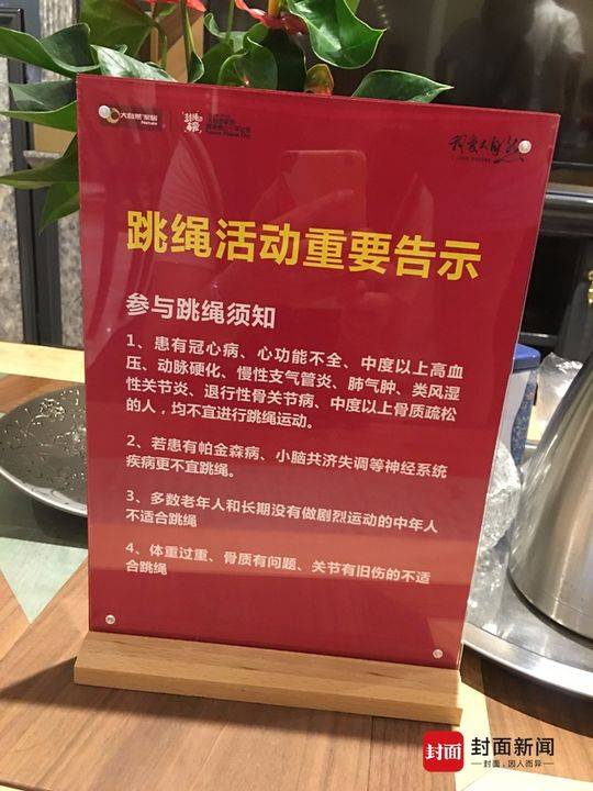 记者还看到,在店铺门厅的桌子上,放着一个《跳绳活动重要告示》,内容是提醒患有冠心病、心功能不全、高血压等疾病的患者慎重参加活动。“我承认,这是在事发第二天才摆出来的。”赵鹏说。