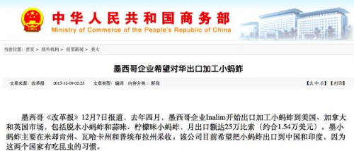 此外,墨西哥也是蚂蚱的重要产地。2014年4月,墨西哥企业Inalim开始出口加工小蚂蚱到美国、加拿大和英国市场,包括脱水小蚂蚱和蒜味、柠檬味小蚂蚱,月出口额达1.54万美元。墨小蚂蚱主要在米却肯州、瓦哈卡州和普埃布拉州采收。该公司目前希望把小蚂蚱出口到中国和印度,因为这两个国家有吃昆虫的习惯。