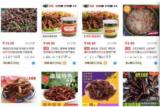 在路边摊上,一份油炸蚂蚱在20元左右。在餐馆里,一盘油炸的蝗虫约半斤,售价30元左右。但是,每经小编(微信号:nbdnews)在某电商平台上发现,有接近200家电商在网上做起了油炸蚂蚱的生意。从价格上看,不同产品的价格差距很大,其中,50元左右一斤的居多,100元左右一斤的也不少,最贵的油炸蚂蚱价格高达350元/一斤。仅从电商平台上的报价来看,蚂蚱的价格普遍比火热的小龙虾价格还要高。
