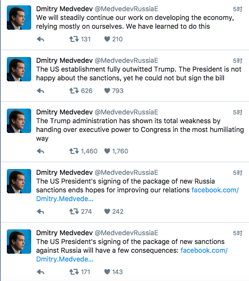 8月2日,在特朗普签署制裁法案后,俄罗斯总理梅德韦杰夫在社交网站上连发数条信息回应。在Facebook上,他将制裁称作“一场全面的贸易战”,并写道“我们与美国新政府改善关系的希望破灭了。”