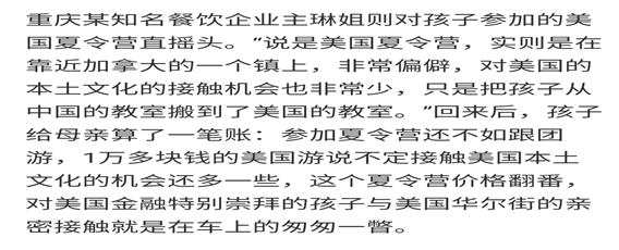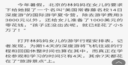 最终结果是,孩子们蜻蜓点水式的经历普遍让家长们对半个月左右人均花费了三五万元的游学失望不已,对游学的投诉也逐渐增多,“大学游变成校园游”、“英语得不到提高”、“游学变购物”等质疑声不绝于耳。