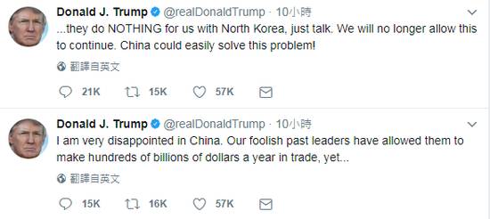 朝鲜星期五深夜进行新的导弹试射之后,特朗普总统在美国时间星期六晚上发推特抱怨说:“我对中国非常失望,过去我们愚蠢的领导人允许他们每年在贸易中赚取数千亿美元,但他们在朝鲜问题上没有为我们做任何事情,就知道说说而已。我们不会让这继续发生,中国可以很容易解决这个问题!”