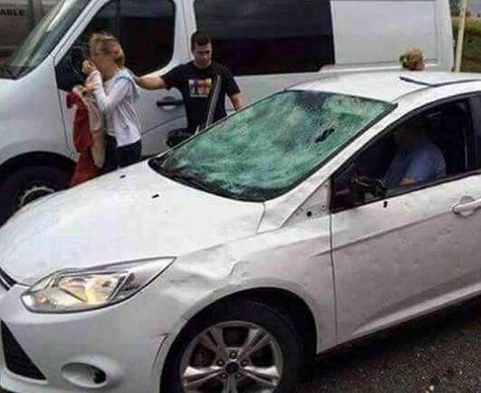 这辆车的每个方位都被砸的坑坑洼洼,挡风玻璃全部都碎掉了,好像经历了大型车祸一般,不仅如此,当地很多树木和住宅的窗户都被砸的乱七八糟。