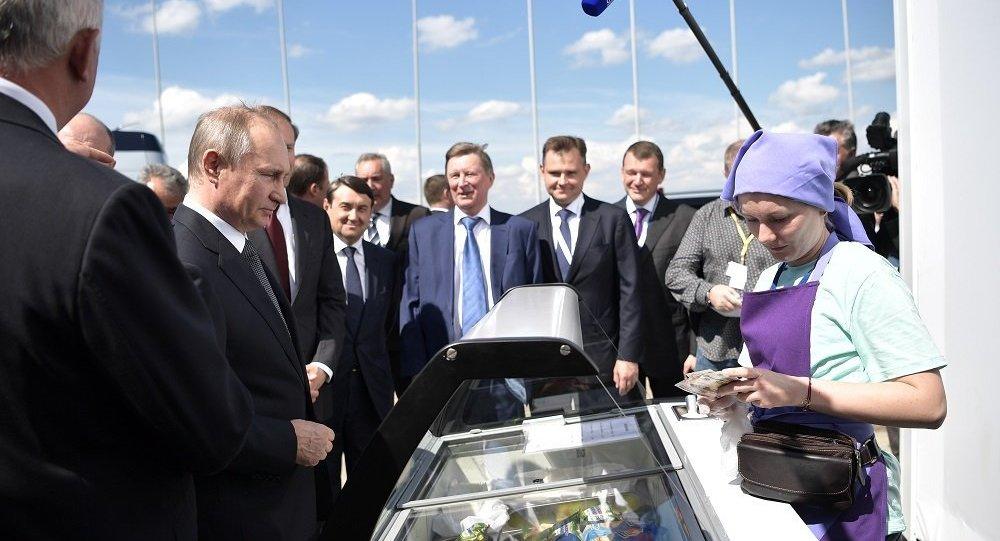 据俄罗斯卫星通讯社18日报道,在莫斯科国际航空航天展览会(MAKS-2017)上,普京在大量政府成员和工业企业领导的陪同下走向了一个售货棚,那里摆放了很多品种的俄制冰淇淋进行售卖。