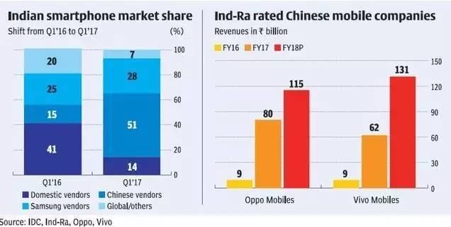 ▲2017年第一季度,中国智能手机占据了印度智能手机市场51%的份额。(互联网数据中心)