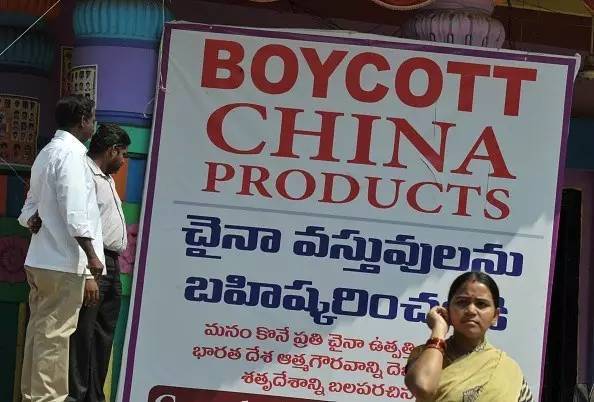 ▲资料图片:2016年11月,印度街头宣传“抵制中国产品”的海报。(法新社)
