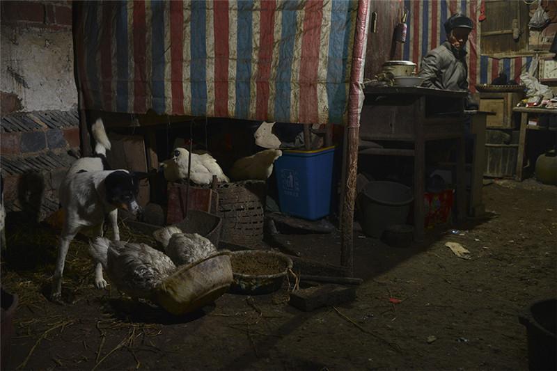 上图是老人和儿子的住所,几只鸡鸭和狗狗都在一个屋里生活,几乎家徒四壁