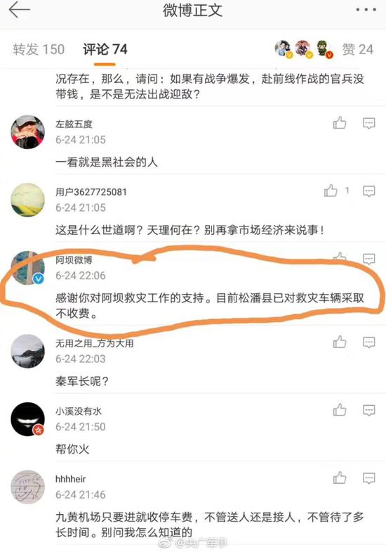 [蛮横小伙向茂县救援军车收费 阿坝回应已处理]今晚8点左右,记者跟随军队救援车辆前往茂县救灾,途径阿坝黄龙机场一处收费站,收费员称:这是私人收费站,去茂县救援的军车也要收费,并对两辆军车分别收费15元和10元。期间收费员态度蛮横,说:“老天爷过去都得收费!我管你们是干嘛的!”@阿坝微博 回应“目前松潘县已对救灾车辆采取不收费”。