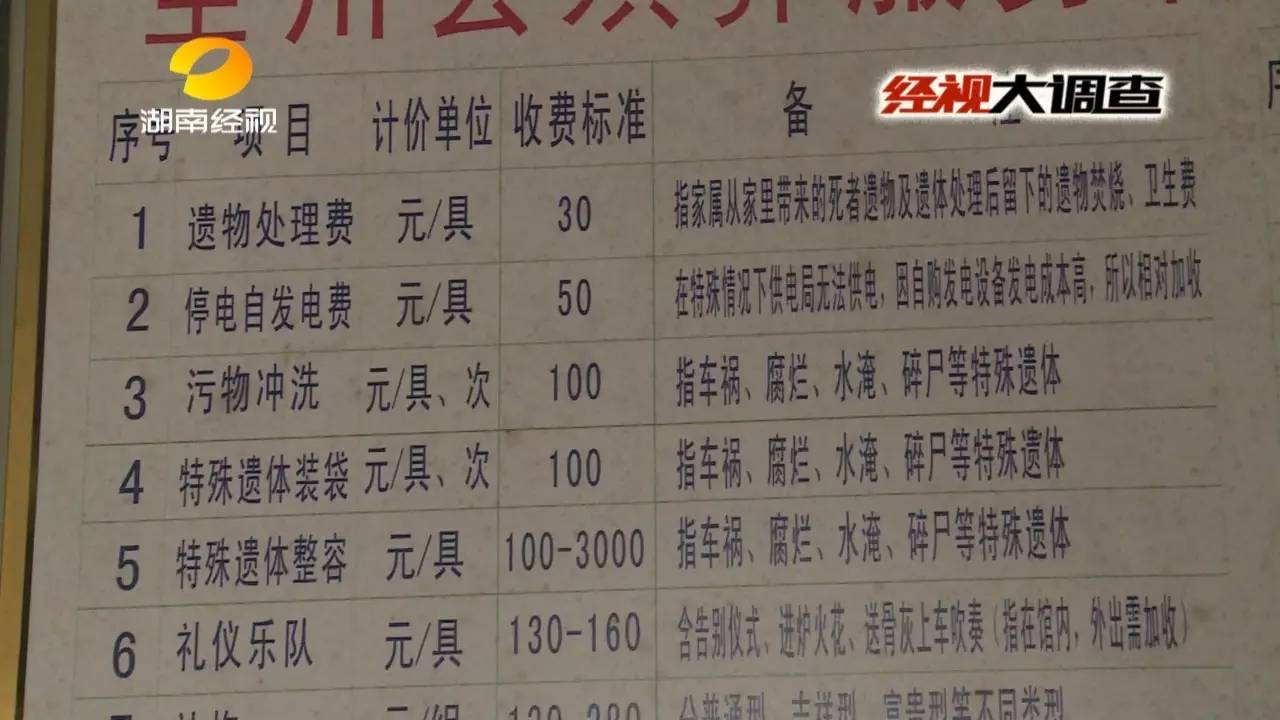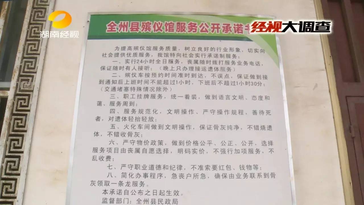 单具遗体只需要2000元男子乱收费高达四倍在全州县殡仪馆业务大厅内,有关收费已经全部公示在墙上,遗体带和卫生费都只要100元钱。