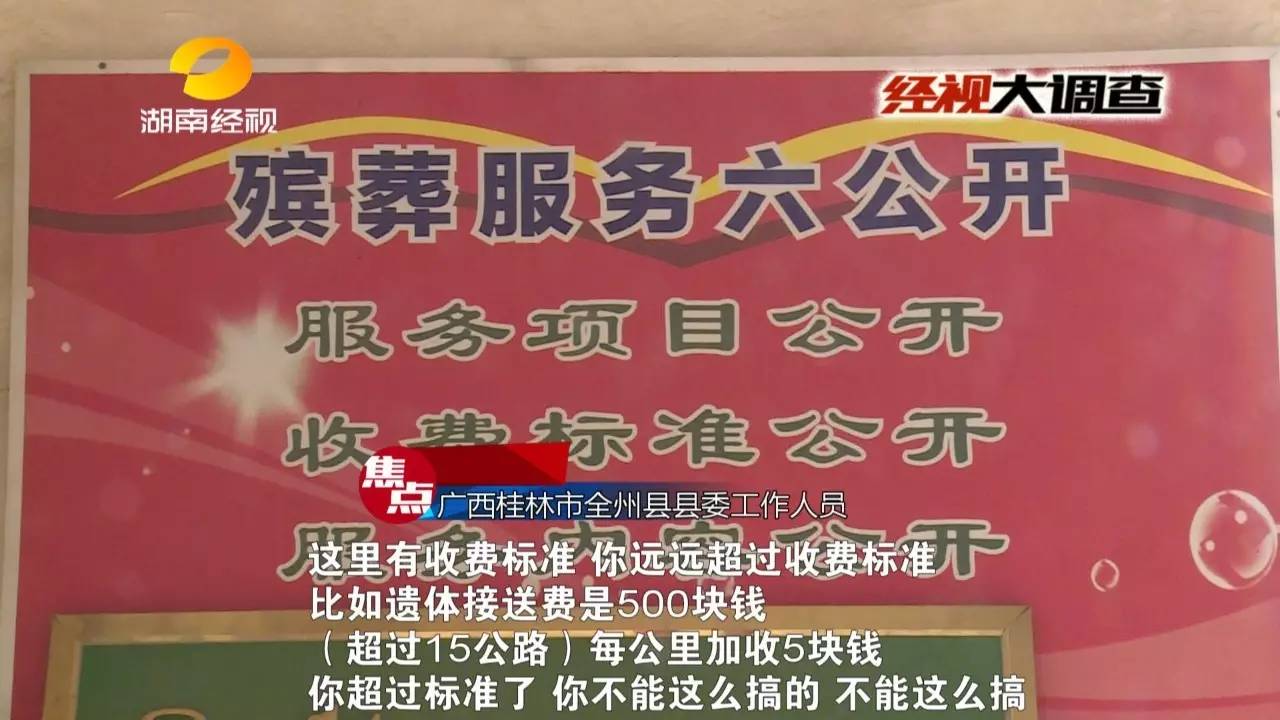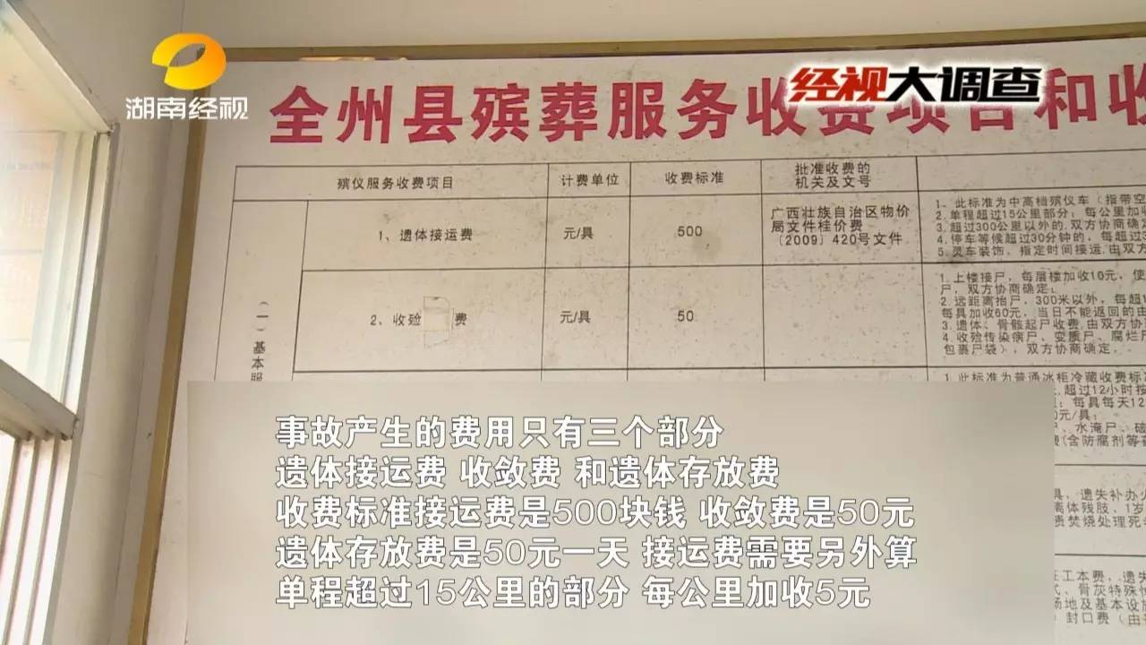 一名自称是全州县殡仪馆的男子声称,死者双方家属必须拿出一万五千元来,才能将遗体运走,据说这些钱是遗体运费,不但一分钱都不能少,还不开发票。