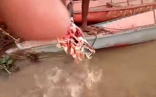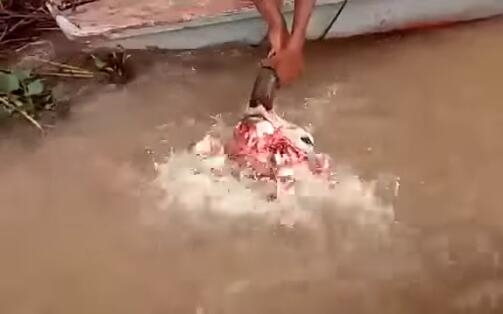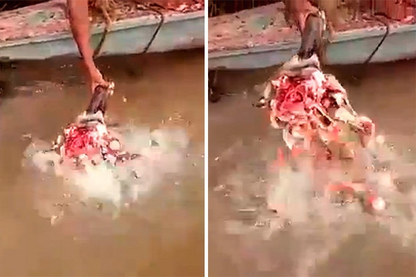 喂了一阵子以后,男子把牛头拉出水面查看,没想到还有不少食人鱼紧紧咬着上面的肉,不愿轻易放口。直到男子再次把头骨放入水中前,都还有数条鱼挂在头骨上没掉落。