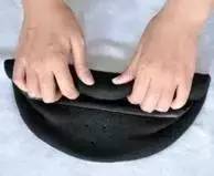 水洗后将贝雷帽帽口向上,沿后侧向前卷压至前帽口处,向左右两侧挤压水分,然后帽口向上摊平放在铺有干毛巾的平台上,依据帽型按压帽顶及帽口边缘处,也可使用熨斗熨烫使之平整;