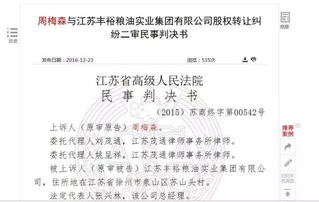 2009年12月,周梅森和丰裕公司签订相关的股转协议,丰裕公司以1200万的价格将该部分股权转让给周梅森。