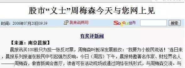 周梅森呼吁中小散户团结起来,在股东大会上投票否决大股东的股改方案。于是,就有了后来记入中国证券史的三封著名公开信:《作家周梅森致全国流通股股东的一封公开信》、《周梅森致非流通大股东并国资部门的公开信》和《周梅森致管理层的公开信》。
