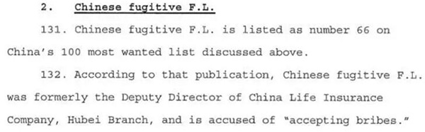 搜查令申请书显示,至少有3名客户是中国外逃人员,而且他们最终还获得了美国“绿卡”。通过对照搜查令申请书和中央纪委监察部网站信息,每经小编(微信号:nbdnews)发现,这3位外逃人员中,包括“全球通缉百名外逃人员”13号在逃人员、曾任湖北省武汉市发改委主任的徐进,以及徐进的妻子、66号在逃人员、曾任中国人保湖北分公司副处长的刘芳。
